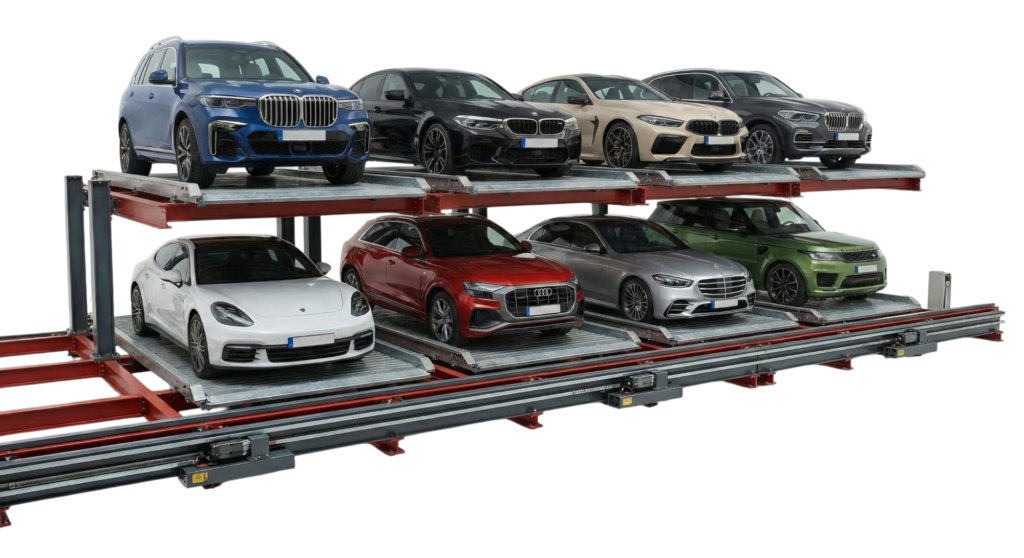 El multiparking automatizado es un sistema de parqueo que se acciona mediante sistema hidráulico o motor eléctrico operado mediante un PLC, este sistema puede ser construido desde 3 pisos bajo tierra hasta 15 pisos sobre el suelo. El equipo está disponible para automóviles y camionetas, la capacidad esta entre 2000 kg y 2500 kg.